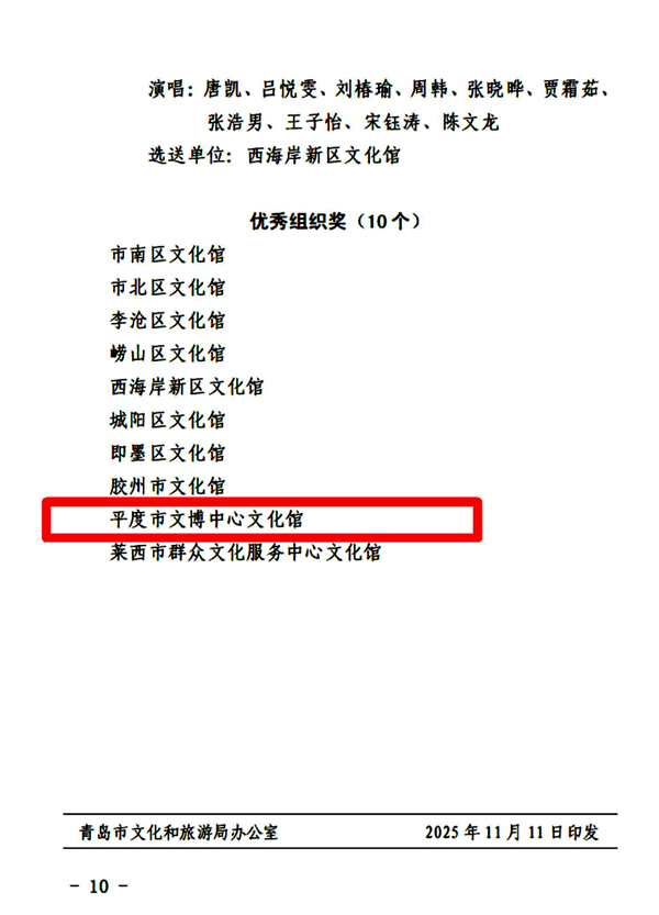 鲁网11月14日讯(记者 潘亚妮 实习记者 刘悦)近日,青岛市文化和旅游局发布《关于青岛市第十三届“海燕奖”群众文艺原创作品大赛(音乐类)获奖情况的通报》。由平度市文化和旅游局选送的原创音乐作品《大昆仑》荣获一等奖,《你是我的爱,平度!》荣获三等奖,平度市文博中心文化馆获得优秀组织奖。