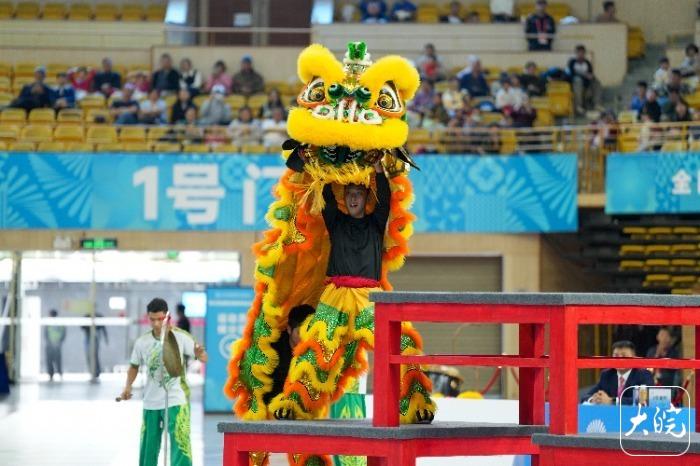 大皖新闻讯 佛山,黄飞鸿故乡。十五运会群众展演舞龙舞狮项目南狮传统决赛13日在佛山岭南明珠体育馆举行。2006年,南狮入选首批国家级非物质文化遗产。