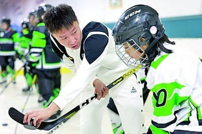 新疆乌鲁木齐,新疆教育学院实验小学的体育老师(左)在指导学生练习冰球。新华社发