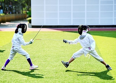 重庆江北区新村同创小学击剑社团的学生在练习击剑。新华社发