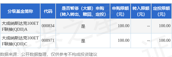 本站消息,11月13日大成基金管理有限公司发布《关于大成纳斯达克100交易型开放式指数证券投资基金联接基金(QDII)调整大额申购(含定期定额申购)业务的公告》。公告中提示,为了维护基金份额持有人利益,保障基金的平稳运作,自2025年11月14日起大成纳斯达克100交易型开放式指数证券投资基金联接基金(QDII)调整大额申购(含定期定额申购)业务,申购上限金额为0.01万元,下属分级基金调整明细如下:
