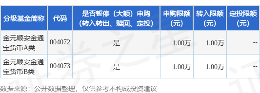 本站消息,11月13日金元顺安基金管理有限公司发布《金元顺安金通宝货币市场基金基金暂停(大额)申购(转换转入、赎回、转换转出、定期定额投资)公告》。公告中提示,为保证本基金的稳定运作,保护基金份额持有人利益,自2025年11月13日起金元顺安金通宝货币市场基金基金暂停(大额)申购(转换转入、赎回、转换转出、定期定额投资),申购、转换转入上限金额为1.0万元,下属分级基金调整明细如下:
