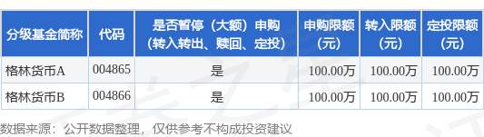 本站消息,11月13日格林基金管理有限公司发布《格林日鑫月熠货币市场基金暂停部分代销机构大额申购、定期定额投资与转换转入业务公告》。公告中提示,为保证本基金的稳定运作,保护基金份额持有人利益,根据《格林日鑫月熠货币市场基金基金合同》、《格林日鑫月熠货币市场基金招募说明书》及其更新的相关规定,本基金管理人决定于2025年11月13日起暂停部分代销机构本基金100万元以上(不含100万元)的申购、定期定额投资及转换转入业务,自2025年11月13日起格林日鑫月熠货币市场基金暂停部分代销机构大额申购、定期定额投资与转换转入业务,申购、转换转入、定投上限金额为100.0万元,下属分级基金调整明细如下: