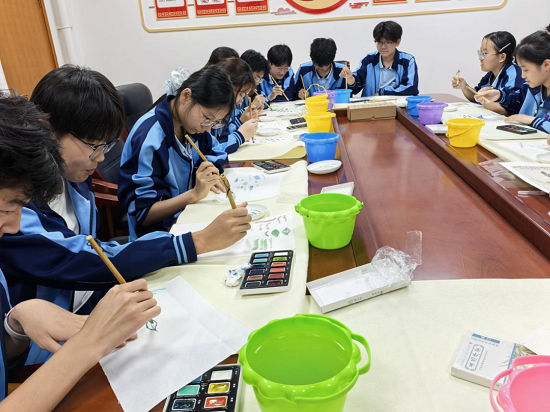 在认识了毛笔、宣纸、颜料等充满东方韵味的画材后,同学们在老师的引导下进行了特别的自我介绍——不仅介绍自己的姓名,还用一种颜色来描述当下的心情。有的同学用“明媚的黄色”表达对新活动的期待,有的则用“宁静的蓝色”描绘此刻平和的心态。这一环节迅速拉近了彼此的距离,也让同学们初步体验到色彩与情绪的奇妙联结。