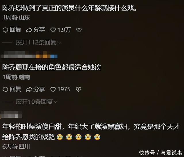 观众们也是感慨,“陈乔恩真正做到了什么年龄就接什么戏!” 纵观陈乔恩的演艺之路,她在41岁结束了自己最后一部偶像女主戏《遇见·璀璨的你》。