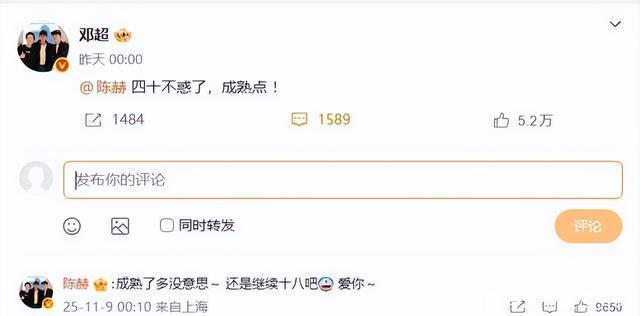 从这也可以看出,几人的关系也确实好,要不然也不会在凌晨就纷纷送上自己的祝福,而陈赫也没闲着,挨个转发评论。 先是邓超在零点准时发布了一条动态,先是艾特陈赫称四十不惑了,让他成熟一点,陈赫的回复也是非常的调皮,希望自己的继续18。