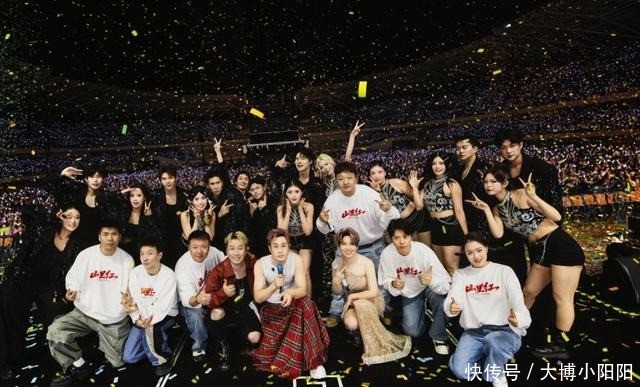 最后和现场的工作人员还有台下的观众们一起来了一张大合照,他们一群人在舞台上站着或者蹲着,