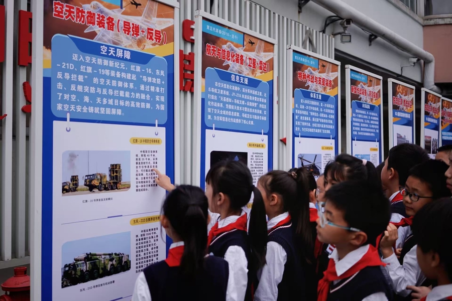 “戎爱课堂”环节亮点纷呈。陆军大校费志杰以“雄鹰展翅 护卫空天”为题授课,用通俗易懂的语言讲解空军知识,让同学们真切感受中国空军的强大实力,为成长注入精神力量。退役军人王正明带来《匠心铸剑 文化强军》戎爱文化课,从“戎”“卫”“国”等甲骨文字切入,带领孩子们探寻汉字构形中的国防意蕴。从笔画溯源到历史故事,孩子们在学习中触摸中华文明深厚根脉,读懂“国防”二字承载的沉甸甸责任,家国情怀的种子在心中悄然扎根。